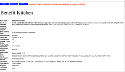 USPTO Trademark Search for “Benefit Kitchen” showed only this one, registered 2015, first used in business 2014, owner Self-Sufficiency Solutions, LLC. (Click image to enlarge). Searched 12/8/2017