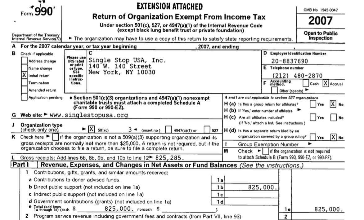 Single Stop USA (initial return FY2007) shows $825K grants. Elsewhere on this return, and apparently not included in that amount, is $224K of “donated services or use of facilities.” and specific mention made of RHF’s commitment to funding.