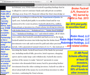 (but not limited to) “Robin Hood Holdings LLC” in Delaware and a broker (now barred) Charles Caleb Fackrell in NC, re-inforce my concerns in general about the “related entities” and “alternate investments” warehoused under apparently, mutual-benefit-exchanging nonprofits. (Michael Weinstein, the (per website) Chairman of Single Stop USA, Inc. — which in only FY2014 acknowledged its own “disregarded entities” of similar name, was also, until very recently, per RHF’s website, “Chief Program Director” director and is now leaving, with long-term program person Emary Aaronson, to another named charity (i.e., SingleStopUSA not mentioned here). both organizations feature high-profile people, with a high dose of Harvard and Columbia University backgrounds, and industries…