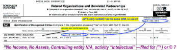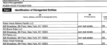 Robin Hood Fndtn’s YEDec20115 Sched R Pt I DISREGARDED ENTITY ROBIN HOOD HOLDINGS (Sched R Disregarded entity) (shown w|o any suffix indicator and possibly a wrong EIN# (same as the 501©3’s offered) from its website.