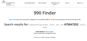 Where Is It (and any Form 990)? Step #3: But, no full-sized Form 990s found so far, at least here, by EIN# search, on “47570542.”