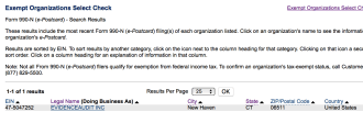 Having found no full-sized Forms 990 by EIN# search (at least at that database) another possibility is that the entity filed just an electronic post-card. Step #4, Form 990-N search by EIN# (at IRS ExemptOrgSelect website), results found also show a different entity name, EVIDENCEAUDIT INC... . For such new organization, that’s a fast name-change, although name-changes, if registered (later lookups in CT show it was) aren’t illegal. Only Year filed: 2015