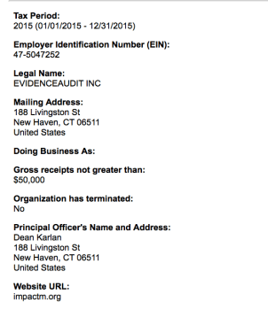 Step#5, click for “Details” on 990-N search results; these are the details for what was then “EvidenceAudit, Inc. also gives an entity website, “ImpactM.org”) No other (before 2015 or for 2016) Forms 990N (or any other kind of Form 990N) showing so far. Notice: FY=Calendar Year, and principal officer is Dean Karlan.[see next image; founded much larger “IPA” organization