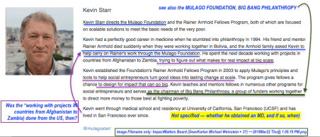 ImpactMatters Board (cf Kenneth Starr (Mulago Fndtn, Big Bang) affiliations. Mulago Fndtn Form 990PF shows him paid $300K for his role there; hence volunteering? for ImpactMatters shouldn’t be personal fiscal burden..