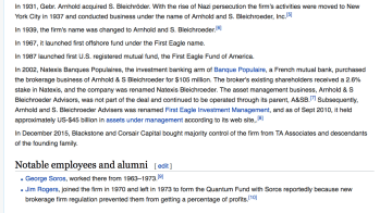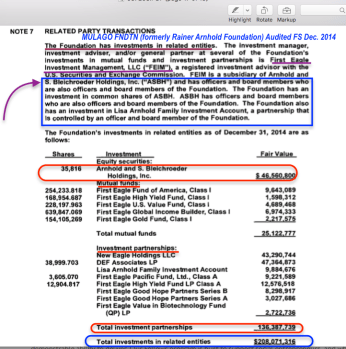 Although Mulago Foundation website features philanthropy of Kenneth Starr’s friend and mentor Rainer Arnhold, and does mention he was born into an investment banking family, served in U.S. Army (WWII), etc., only the financial statements would show terms such as those found in the “Related Entities Investments,” such as Arnhold & S. Bleichroeder Holdings, Inc. (“ASBH”) (See two images from Wikipedia nearby), or First Eagle Investment Management LLC (SEC-registered and, at time of the FS, subsidiary of ASBH). Subsequent (2015ff) events show major name changes, a July, 2015, announcement at “FEIM” that Blackrock and Corsair Capital were making significant long-term investments in First Eagle ** and an FTC Sep. 2015 link mentions that ASBH, Inc. was bought by another group.