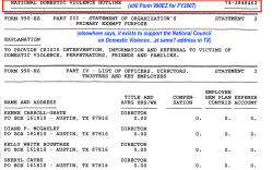 Nevertheless, I see an organization at a PO Box in Austin Texas, by this exact same name (National Domestic Violence Hotline) which for SEVERAL years in a row, starting with Fiscal Year (begins Sept. 1, ends Aug. 31 the next calendar year) 2007 reflected contributions & grants of exactly 0.00, i.e. ‘nothing.’ At the above link (and below, I provided six FY2007 Form 990 EZ annotated images during post 2018 update), on top left, you can see “Initial Return” checked. Each subsequent year (and I just checked them) still reads “$0” funds received — until the last year shown in the next table, they filed a ‘Schedule N” Dissolution. They said there were no assets to distribute. This organization filed several years in a row as a completely empty “drawer” at that PO Box. People are not always consistent labeling even their own organizations on tax returns, but I did notice that in (I believe it was) Year 2009, it picked up the name “foundation” — but without checking “name change” on the heading.