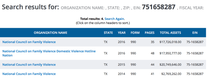 - The THIRD “related organization” was “National Council on Family Violence.” The TCFV tax return gave the EIN# on its “Schedule R” (for “Related Organizations”) so here it is: