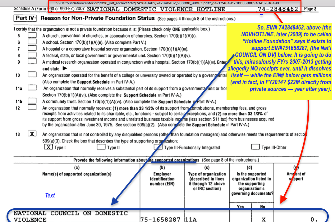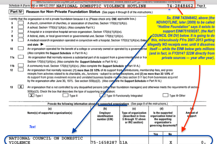 The National Domestic Violence Hotline: 1-800-799-SAFE, looks like Move-the-Money Shell Games around $57M HHS grants (1995-2016). » NDVHotline EIN# 742848462<~~No Website Admitted (990EZ FY2007 |FY2009 add Fndtn to name) ~~SSh 2018Apr'06 Fri @7.26.53 PM 00004