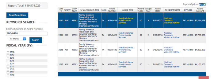 The National Domestic Violence Hotline: 1-800-799-SAFE, looks like Move-the-Money Shell Games around $57M HHS grants (1995-2016). » TAGGS basic (not Advanced) search of Award 90EV0426 to Nat’l DV Hotline, run 2018APR06 at 6.40PM