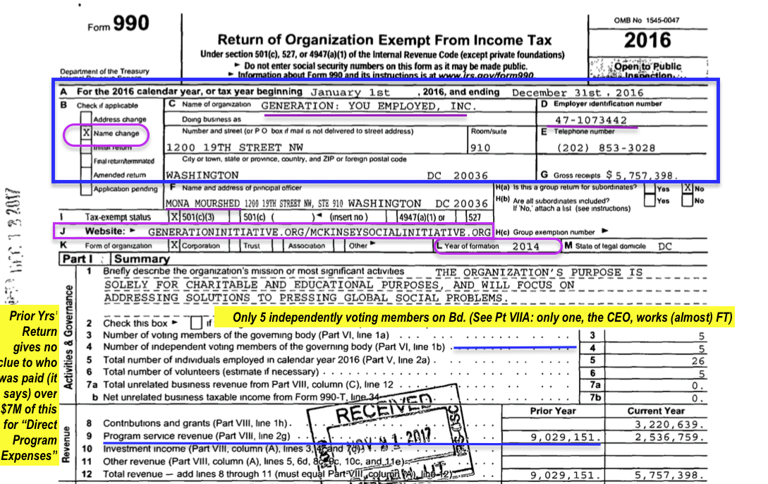 Q1, 2018 Posts and “You Are Here,” on my Blog. Meanwhile, WE are Here, Collectively. (Or, from ‘Hewers of Wood + Drawers of Water’ To Functionally and Financially Illiterate** Consumers of Information, Products, and Social Services). (Publ. April 19, 2018) » Generatn|You Employed, Inc’ FY2016 (YEDec) Form 990 (pg1, Pt I thru Ln12)(EIN#471073442, 2014ff, formerly McKinsey Social Initiative, NAMECHANGE 2016)~~SShot 2018Apr19 @4.51PM