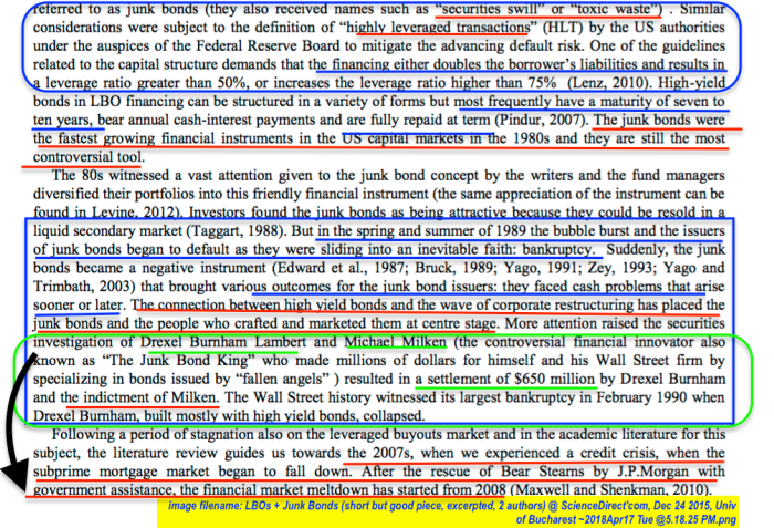 Q1, 2018 Posts and “You Are Here,” on my Blog. Meanwhile, WE are Here, Collectively. (Or, from ‘Hewers of Wood + Drawers of Water’ To Functionally and Financially Illiterate** Consumers of Information, Products, and Social Services). (Publ. April 19, 2018) » LBOs + Junk Bonds (short but good piece, excerpted, 2 authors) @ ScienceDirect’com, Dec 24 2015, Univ of Bucharest ~2018Apr17 Tue @5.18PM