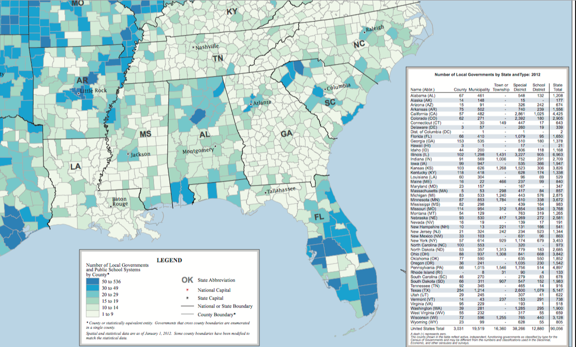 Image detail (lower-right = SE USA) enlarged so LEGEND and Counts are visible. Notice which areas have more (darker blue, teal) vs. less (lighter sections) governments. Click Image to enlarge.
