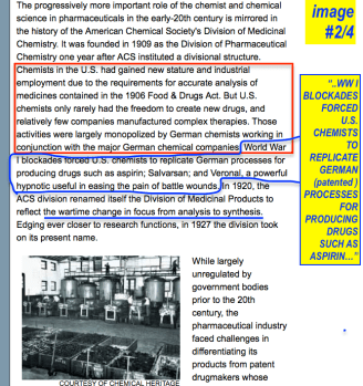 When it comes to the field of psychiatry, psychoanalysis and psychiatry (and corresponding mental and behavioral health), obviously due to the persuasion necessary (versus brute force of government ONLY), those fields’ origins are closely tied to commandeering organized military behavior for war efforts. Both fields had plenty of people to observe and practice / learn upon after each war. Consider also the chemical industries’ major prosperity due to war efforts, and thereafter, turning some of this expertise (and massive resources) as well into what is now the pharmaceutical industries. Four screenprints here from Chemical & Engineering News (“gallery” format allows click any image to enlarge + to navigate direct to others using arrows provided).