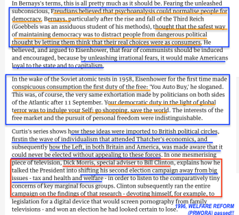 March 10, 2002 article on Bernays: “How Freud Got Under Our Skin” under “Education” in “The Guardian.” See nearby image (annotated) for post-World War II relevance, and even a reference to (mid-1990s) the Clinton (in the UK, Blair) Administration, Dick Morris, and appealing to marginal groups rather than key issues like tax and healthcare reform