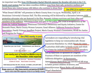 No attempt to incorporate the information into existing agenda (or explain why it shouldn’t be so incorporated IF it’s factual, relevant, and important enough to talk about at all) is showing up in the organizations’ newsletters, on-line, or in general that I can see, among the very articulate and vocal proponents who love? to expound on blogs (theirs and others), join or form new nonprofits and hook up with traumatized family court-veteran mothers empathetically and (of course) often accompanied by petitions or virtual orders to support attacks on specific judges, or specific legislation such as the recent H.Con.Res.72.