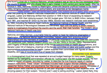 Naturally, the Lasker wealth (like others’) was poured into tax-exempt foundations, but her main purpose was ensuring the U.S. Government poured funds into her causes. She wanted universal healthcare, but “settled” for a huge federally-funded biomedical research (grantmaking) infrastructure with special focus on things which had affected her personally (Cancer — Albert Lasker died from it), and Birth Control (later “Planned Parenthood”), and of course, Mental Health.