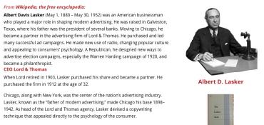 (From “Scientific Advertising” quoting Wikipedia, w/ some extra images).Pls. click to Enlarge, Albert D. Lasker, 1888-1952, note his father just happened to be president of several banks; move to Chicago, became partner of Lord & Thomas at only age 32…