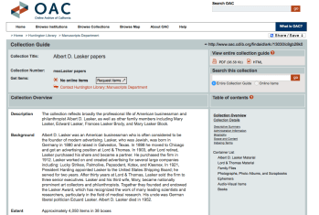 PLS. CLICK TO ENLARGE (or click link to access): Summary of Lasker Papers from OAC (Online Archives of California): over 4,000 boxes. Note the brand names (Pepsodent, Palmolive, Kleenex, Kotex) cigarette brands (Lucky Strikes) and that in 1921 he was head of Shipping Board appointed by Pres. Harding)