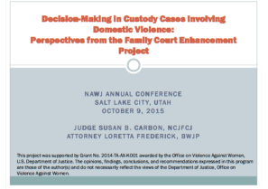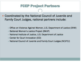 Note: Project funded by a USDOJ (OVW) grant, as presented at “NAWJ” (National Association of Woman Judges), with both Judge Susan B. Carbon (formerly Director of OVW and its major discretionary grants funding) + Loretta Frederick “BWJP” (which operated under a “parent organization” for decades until separating itself, finally, only in 2013 just in time to be one of the chosen favorites for this project. Judge Carbon had also been a family court judge in New Hampshire prior to her time on OVW. “NCJFCJ” meanwhile is a judicial membership organization (501©3) based (mostly) in Nevada