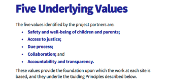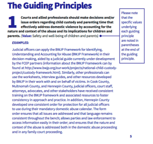 Notice the “Values List” that for one of the Guiding Principle #1, judges are encouraged to read the “BWJP framework.” And, as ever, “Collaboration” (“multi-disciplinary” solutions) is a key component. Guiding Principle #6 (not imaged — see link) includes to continue pushing for alternate dispute resolution (mediation, etc.) services to “Expedite” hearings where children or others might be in danger.