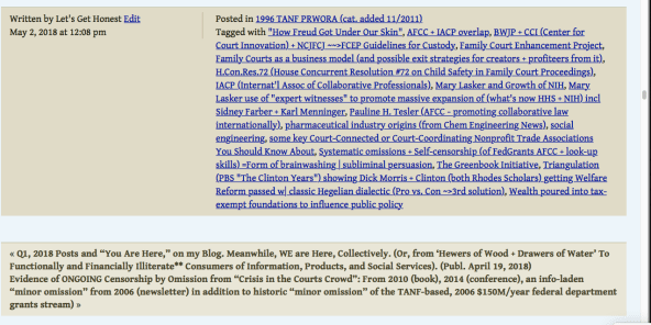 Screenshot of LGH’s Tags for May 2, 2018 post “In 2018, Clamors to Fix, Reform, or Make Kids Safe WITHIN Family Courts…” a.k.a. “Welcome To My Blog” 2nd to top sticky post (Jan. 13, 2019 revs), Bottom shows also previous and next post titles. NB: Some tag names are quite long.