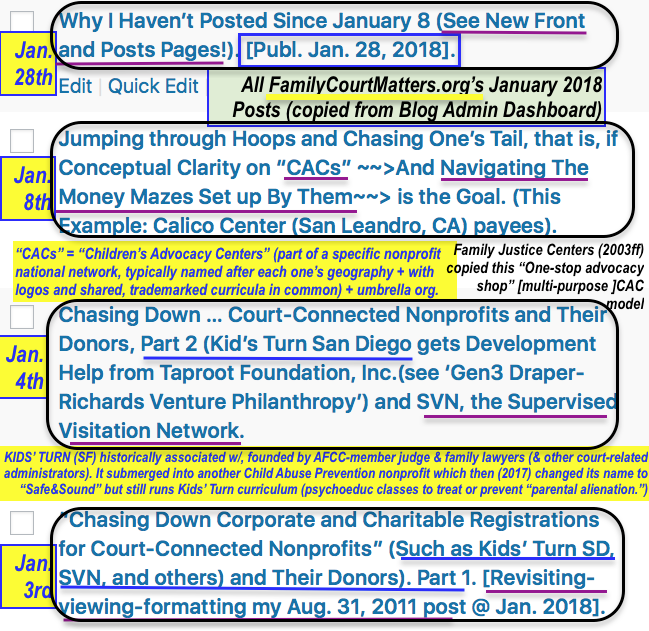 FamilyCourtMatters’ Jan. 2018 published blogs. Image would be titles-only w/o my colorful comments on the subject matter of each post.