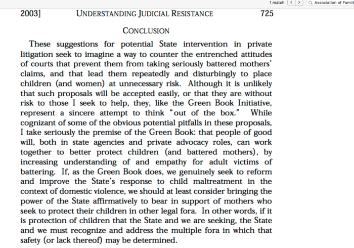 2003 Joan Meier (GWU law) DV, Child Custody, Child Protectn UNDERSTANDING JUDICIAL RESISTANCE (blog this, endorses Greenbk, NCJFCJ, quotes AFCC, ignores PRWORA!) [Conclusion]~~Viewed 2018Apr26