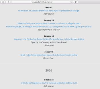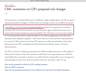 “Family Court and CPS Reform Movement Hits Mainstream” (5-18-2018 post, one of only two shown) on “ExpartePress.com” showed up on as a link on a Twitter account advertising a rally. It was fairly local (a few SF Bay Area counties mentioned) and, it says, organized by “Parents Against CPS Corruption” (another linked website) featuring more CPS than Family Court issues. Center for Modern Courts + CJE seem ideologically linked with it (focus on auditing the Commission on Judicial Performance and targeting specific judges for recall). I looked more closely at “CMC” and related filings, case(s), this past May. However now several weeks later, I cannot retrace my former steps & lookups specifically between one under-developed website, another website & a Facebook group, etc.
