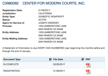 (URL website at top in window frame). This represents an LLC which is continued (though as a new entity) under the Inc. “Center for Modern Courts, Inc.” in California run in part by Mr. Sweeney.
