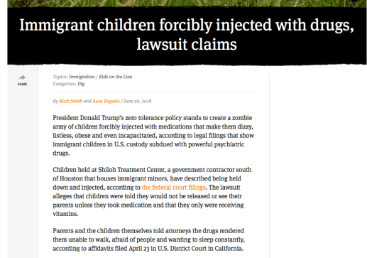 “Immigrant children forcibly injected with drugs, lawsuit claims” as reported on REVEAL.org, the nonprofit “Center for Investigative Reporting” (also searchable on this blog; I think I posted its financials in a different context)