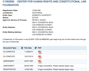 Cal Entity C1062900, CHR & Constitutional Law Foundation Registered 12/29/1981 with California Secretary of State, a “Domestic Nonprofit” current registered agent Peter A. Schey, current address in Los Angeles. (Note: the Entity # can be used in search for its EIN# at the California Office of Attorney General’s (OAG) Registry of Charitable Trusts (RCT) “Verification” page.
