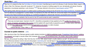 (**“…this age of socially engineered consent” = at least a century! — see Edward Bernays, Freud’s nephew, the role of advertising agencies in this consumer-driven culture, Albert Lasker, Lord & Thomas (Chicago), and his widow Mary Lasker’s role in bulking up the “NIH,” etc.). Or see (previously posted on this blog) “The manipulation of the American mind: Edward Bernays and the birth of public relations..” in “The Conversation.com”). If it worked in wartime, why not in peace also? The word “propaganda” (properly in my opinion!) had a negative connotation — so “public relations” was the euphemistic substitute. “Wiki” shows how Bernays was Freud’s “double nephew”:
