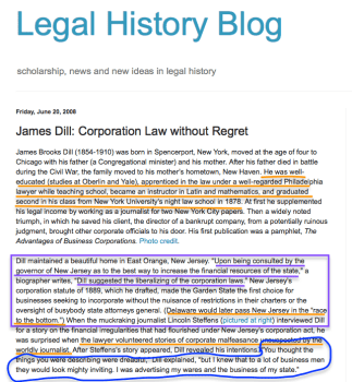 “James Dill: Corporation Law Without Regret” http://legalhistoryblog.blogspot.com/2008/06/ james-dill-corporation-law-without.html See bottom of the annotated image; Dill knew what he was doing in making it known that NJ was the state (and he was the service-provider) in which to get around restrictive laws and nosy state attorneys-general concerned about potential monopolies and a muckraking journalist helped unintentionally with the PR…
