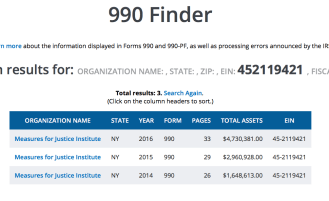 Measures for Justice Institute (EIN#452119421) Click to enlarge. Notice it’s gradually growing. FYI, another backer is Draper Richards Kaplan Foundation, and (not majority) some US DOJ grants.
