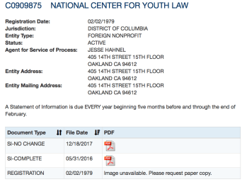 Multi-page pdf; click twice to view: National Center for Youth Law (Calif OAG Details printed 7-31-2018, w access to 990s and RRF filings) EIN#942506933 CalEntity C909875