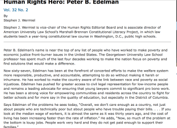 (from: ABA Human Rights Magazine, [summer] 2005, Vol. 32) “Human Rights Hero“) To younger generations of antipoverty activists, Edelman may be best known for a moment of high drama. In September 1996, Edelman resigned his position as acting assistant secretary for planning and evaluation at the U.S. Department of Health and Human Services. Despite having been a close friend of President Bill Clinton, Edelman left Clinton’s administration in visible protest because he felt strongly that the welfare legislation passed by Congress and signed by Clinton would undermine rather than strengthen the fight against poverty. “There was a great opportunity to make positive change,” Edelman recalled recently, “but they moved toward a more inhumane welfare system. . . . They destroyed the safety net.”