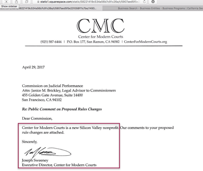 Two Plaintiffs’ Counsel Nonprofits for Class Action Lawsuit (℅ Center for Investigative Reporting article) [Published July 31, 2018]. » 00005 Center for Modern Courts, Inc (EIN#815295623, CalEntity398002, Jan2017ff, website *’org) Joseph Sweeney (SanRamon) working w Kathleen Russell, formerly an LLC)-SShot2018May18 @5.38
