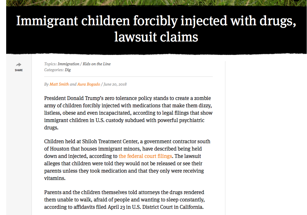Trump’s zero tolerance policy blamed for “zombie army of children forcibly injected with medications that make them dizzy, listless, even incapacitated.” (1) Odd word choice “army” connotates action, possible attack-on-command, danger to a chosen enemy, mobilization. The usage here would seem to be intended to inspire fear of such an army. But the drugging is making the children anything BUT an organized, militant, or assault-ready “army.” So why call them an “army”? || (2) Causation: Did Trump (first year in office, 2017!) ZT policy set up, staff, and fund places like Shiloh Treatment Centers, or did Rx interests?