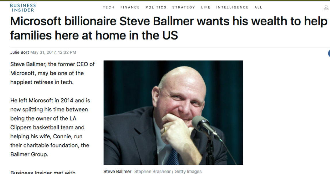 5/31/2017, “Business Insider” article calls “Ballmer Group” a charitable foundation. It doesn’t seem to be, but consults for other foundations, per USPTO.gov and Washington State DOR filings, it’s dba owned by two different LLCs, only one of which (Polpat LLC) shows Steven Ballmer as “Governor”