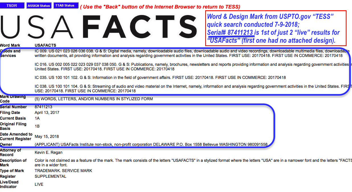Two Plaintiffs’ Counsel Nonprofits for Class Action Lawsuit (℅ Center for Investigative Reporting article) [Published July 31, 2018]. » USAFacts’org @ USPTO’gov shows two live trademark results {Serial#s 87411209 + -213) filed in 2017 by USAFacts Institute (and that it’s a DE nonprofit w WA state PO Box) ~ 2018July