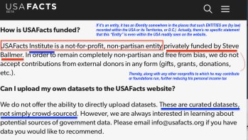 Image (screen snapshots I took from websites) gallery from “Measures For Justice, Inc” “Ballmer Group” and “USAFacts.org” are showing typical coordinated and mutual or sequential foundation backing of specific nonprofits with specific favored projects and maintaining post-funding board control of the project in exchange, in part, for membership on the board of directors and control of the same. USAFacts.org seems to be the most recent of these. Mentioned here as a point of reference and because, in an ideal world, I would go ahead and blog (or someone else might be inspired to, from a consumer/taxpayer, not involved backer, point of view!)