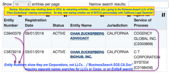 “C-Z” (full-name written out) & a CZI LLCs were formed 2014, 2015, 2016, and 2017. (Meanwhile with Startup: Education self-dissolving in 2016, some 501©s nonprofits, were then dissolved and at least two new ones formed in 2016 and 2017; I showed some in a separate image gallery below in this trust.):