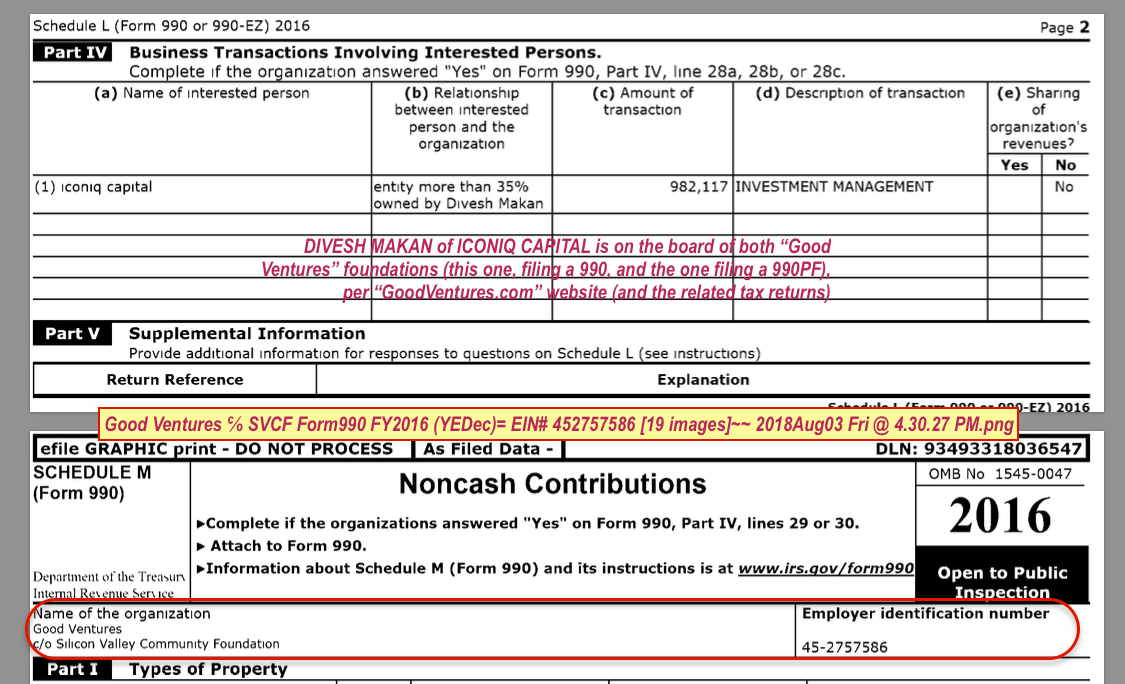 CLICK IMAGE TO READ! Good Ventures (Public, ℅ SVCF) Form 990, FY2016 Sched L acknowledging IConiq Capital’s “Interested Person” status through 35% owner, Divesh Makan (viewed 8/4/2018)