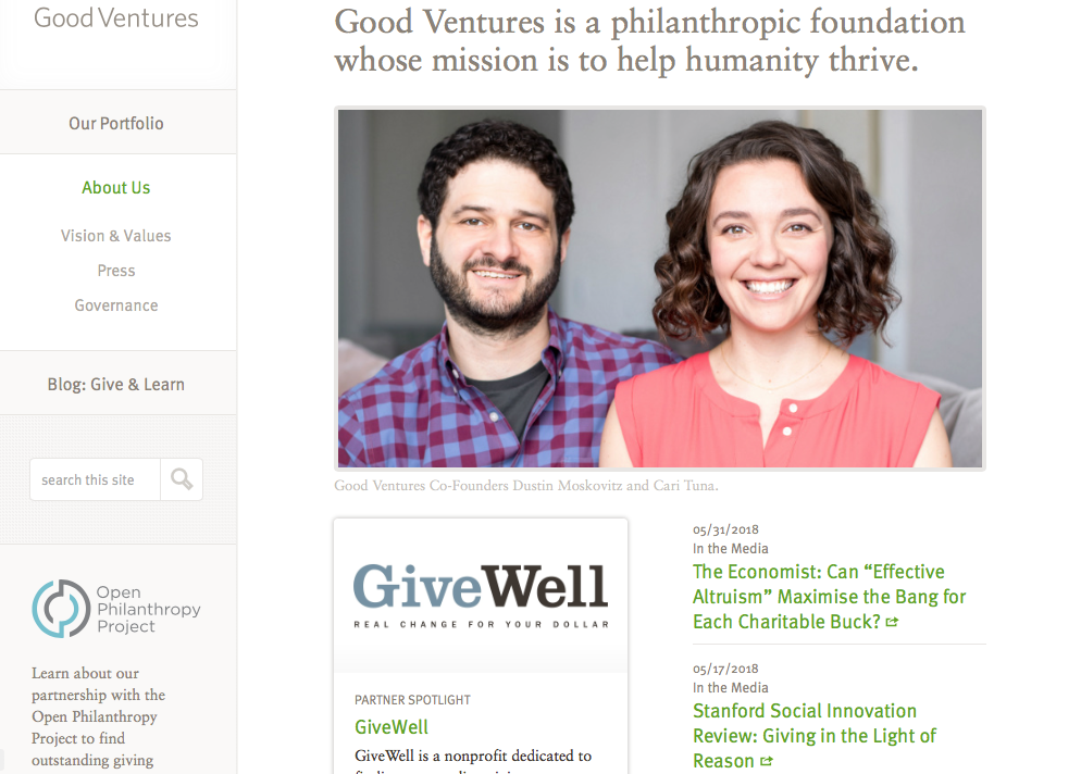Good Ventures website with photos of Dustin Moskovitz & Cari Tuna, but featuring “GiveWell” and “Open Philanthropy.”