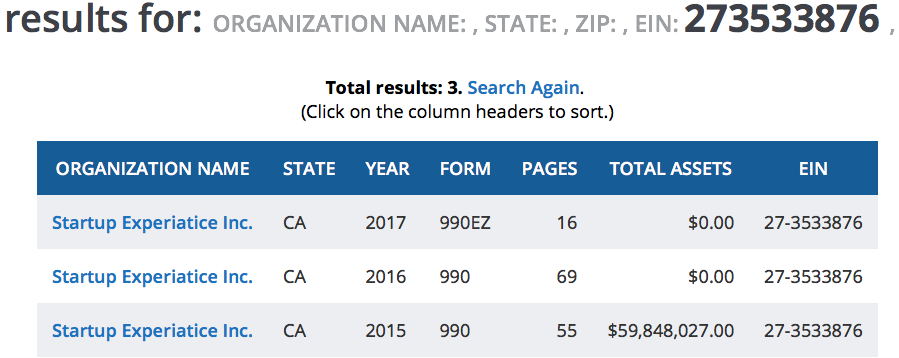 Startup Education Inc (EIN#273533876, Sched-R related to Silicon Valley Community Fund, “SVCF”) (Foundation Center (which provides 990finder) mis-labeling it as “Startup Experiatice“), formed 2011, shows $59M assets one year, “0” the next (and details, that it’s been overspending by millions last two years, without so far terminating itself…