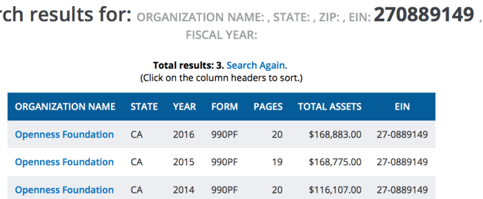 LOOK BEYOND THE LOGO! AND IF A NONPROFIT IS NAMED in the NEWS, OR EVEN HINTED AT IN THE NEWS, LOOK IT UP! » Openness Fndtn EIN#270889149, 990PFs SMALL but CZ (Chan-Zuckerberg) run + founded A related TRUST changed its name 2015 ~~ SShot 2018July16 Mon @4.37.11 PM