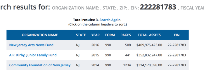EIN# is Community Foundation of NJ, correctly named 1 time out of the 3 results (2014-2016) shown and Startup Education (its final year before dissolving itself) claims $23.9M grantee).