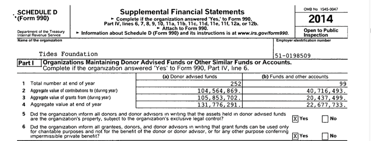 Tides Foundation, EIN# 51-0198509 FY2014 Sched D Donor advised (column a) + Funds & other accounts (column b). Self-explanatory: 252 DAFs, contributions to $104.5M, Grants from $105.8M left aggregated end of year (ln.4) value of $131.7M .. as opposed to the 99 column (b) “Funds and other accounts” which received $40M, distributed about half that and had just over half remaining at the end of the year. (Unfortunately the IRS Sched. D doesn’t ask beginning balance/value). While no question Tides Foundation makes plenty of grants, its $84.3M ( million!) increase in total assets over just two years and the amount shows that it’s primarily about investments. Balance Sheet (Part X) as I recall shows most of it in public traded securities which do not have to be identified (as they would for a private, Form 990PF-filing entity). In FY2016 as previous image shows, those total (gross) assets just passed the quarter-billion-dollar ($250M) mark.