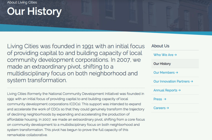 Replicable Models like ~Purpose Built Communities~ Already Have Their (public/private-sponsored) positive PR, but what are the Aftershocks of “Shaking Up Your City” and What, Really, is OUR Bedrock Bottom Line? (started March 14, 2018, edited for about a month, published Sept. 8, 2018) » Living Cities self-descriptns (About, ARs) @2018Apr83.31.50 PM