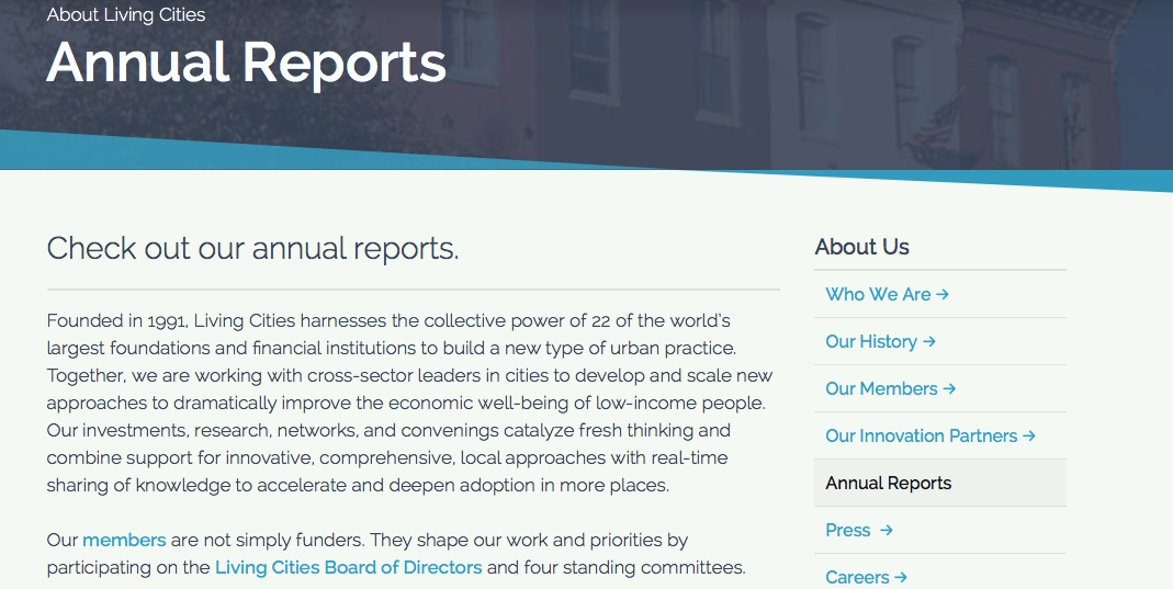 Replicable Models like ~Purpose Built Communities~ Already Have Their (public/private-sponsored) positive PR, but what are the Aftershocks of “Shaking Up Your City” and What, Really, is OUR Bedrock Bottom Line? (started March 14, 2018, edited for about a month, published Sept. 8, 2018) » Living Cities self-descriptns (About, ARs) @2018Apr83.32.26 PM
